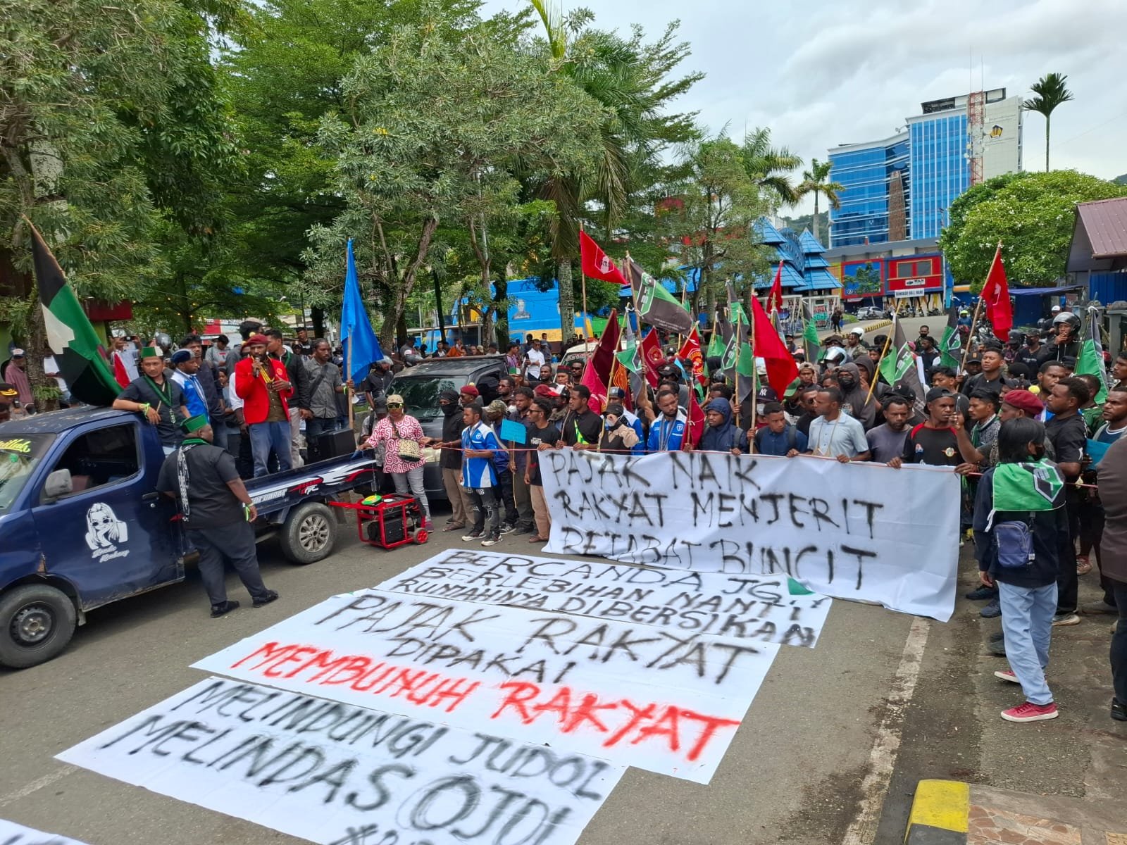 “Kami menolak keras kenaikan gaji dan tunjangan DPR. Rakyat Papua masih susah, sekolah banyak yang rusak, pelayanan kesehatan minim, tapi DPR malah sibuk memperjuangkan kenyamanan pribadi. Ini penghinaan terhadap rakyat,” tegas salah satu orator aksi.