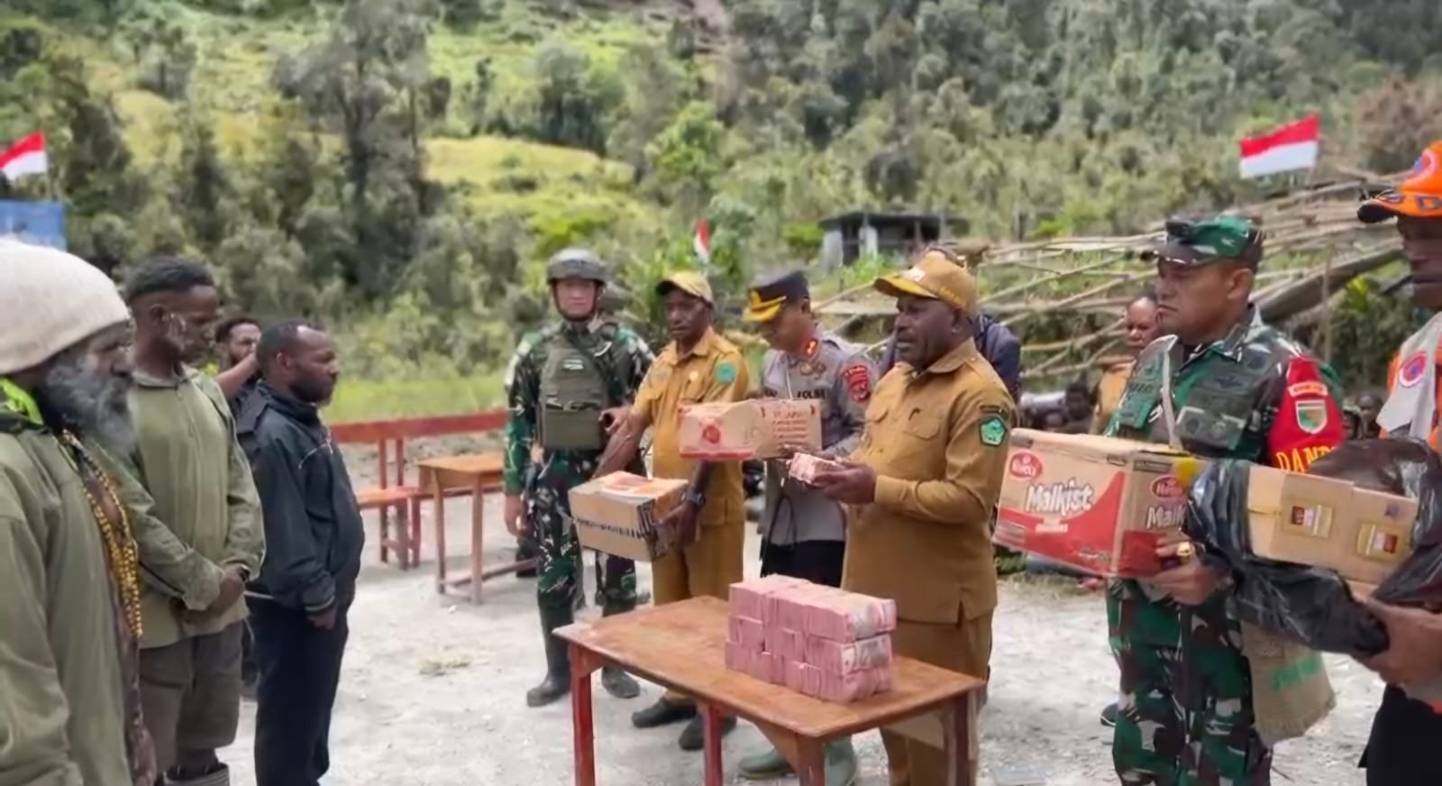 Penyerahan bantuan dilakukan langsung di lokasi bencana, didampingi jajaran Forum Komunikasi Pimpinan Daerah (Forkopimda) Kabupaten Nduga.