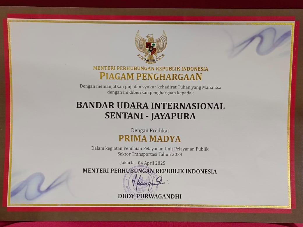 Jayapura,JayaTvPapua.com. – Bandara Sentani Jayapura berhasil mendapat Penghargaan Pelayanan Prima Madya untuk unit pelayanan publik sektor transportasi tahun 2024 oleh Kementerian Perhubungan Republik Indonesia.