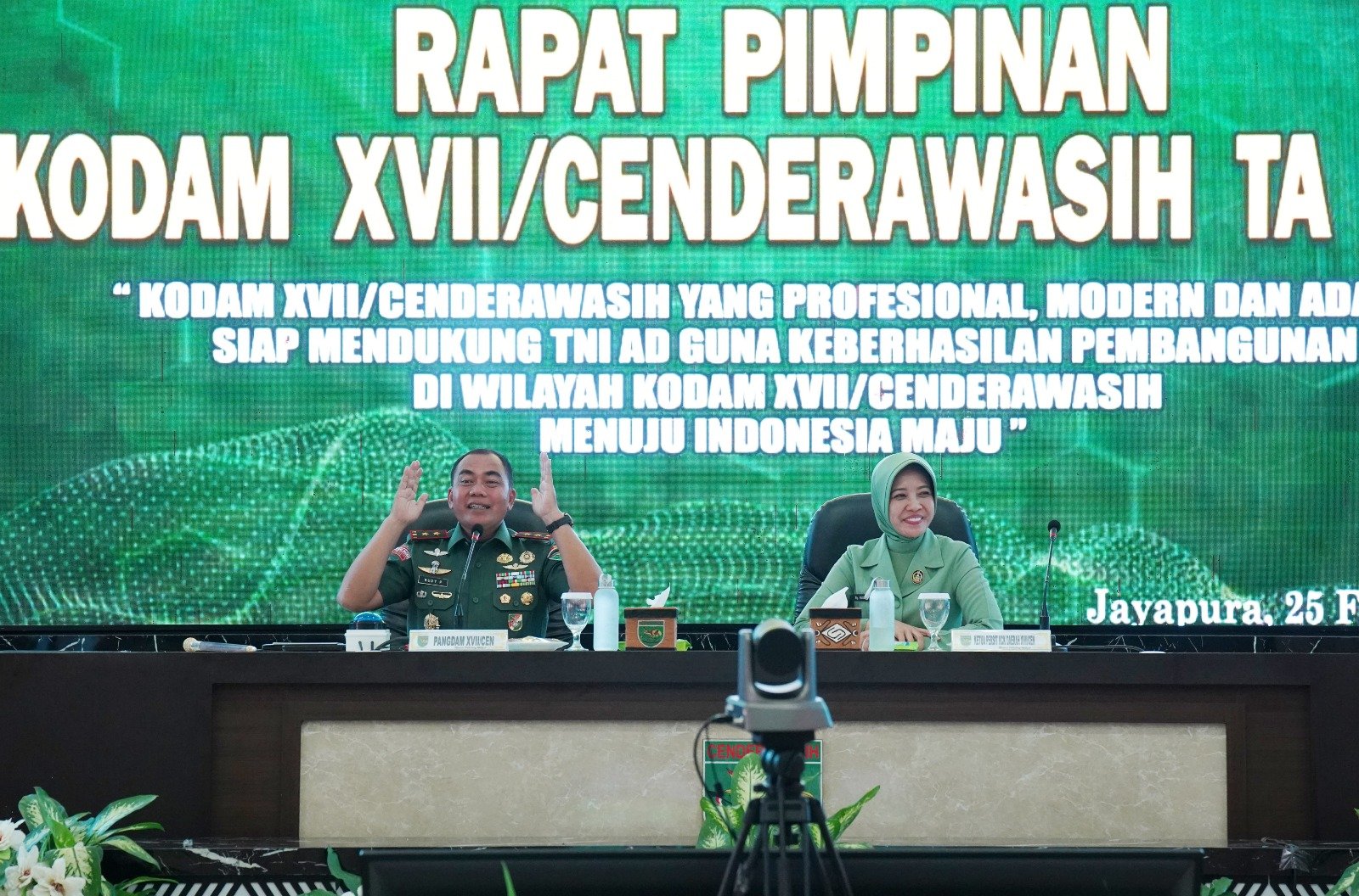 Jayatvpapua.com – Setelah dua hari para Komandan Satuan Jajaran Kodam XVII/Cenderawasih menerima pembekalan dan arahan saat mengikuti Rapat Pimpinan (Rapim) Kodam TA 2025. Akhirnya Pangdam XVII/Cenderawasih Mayjen TNI Rudi Puruwito, S.E., M.M didampingi Ketua Persit KCK Daerah XVII/Cenderawasih Ny. Agustin Rudi Puruwito, secara resmi menutup kegiatan tersebut bertempat di Aula Tony A. Rompis, Makodam XVII/Cenderawasih, Jayapura, Selasa (25/2/2025).