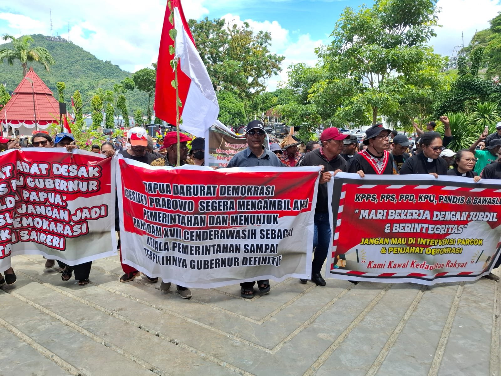 Ribuan masa yang mendatangi Kantor Gubernur Provinsi Papua,dengan membawa spanduk bertulisan,Papua Darurat Demokrasi Presiden Prabowo Segera Mangambil Ahli Pemerintah dan Menunjuk Pangdam XVII Cenderawasih sebagai kepala Pemerintah sampai Terpilih Gubernur Definitif,KPPS,PPS,PPD,KPU,PANDIS dan Bawaslu “Mari bekerja dengan Jurdil & Berintegrasi” jangan mau di intervensi Percok dan Penjahat Demokrasi,Copot jabatan Para Penjahat Demokrasi,Masyarakat adat desak netralitas Pj Gubernur,Polda Papua,KPU,Bawaslu jantan jadi perusak Demokrasi di Tabi Saireri.