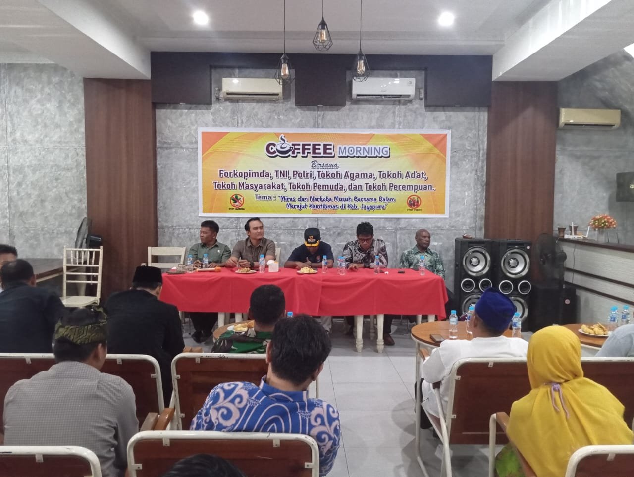 Jayapura,JayaTvPapua.com. – Pertemuan Coffe Morning bertajuk ‘Miras dan Narkoba Musuh Bersama dalam Merajut Kambtimbas di Kabupaten Jayapura’ diikuti oleh Pemerintah Kabupaten (Pemkab) Jayapura bersama tokoh adat, agama, perempuan dan masyarakat di Sentani, Distrik Sentani, Sabtu (4/5/25).