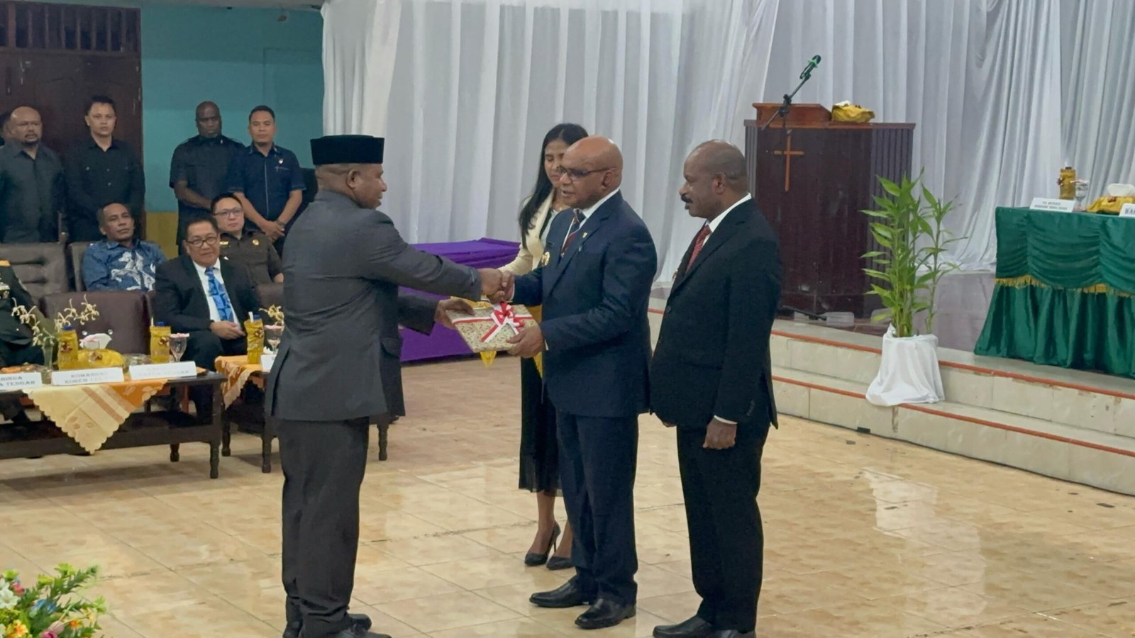 DIKETAHUI SIDANG PARIPURNA DPRD KABUPATEN PUNCAK DIPIMPIN KETUA SEMENTARA MANDELUS TABUNI YANG MENJELASKAN ANGGOTA DEWAN YANG HADIR BERJUMLAH 20 ORANG DAN YANG TIDAK HADIR 4 ORANG/ SEHINGGA MEMENUHI JUMLAH FORUM YANG HADIR.