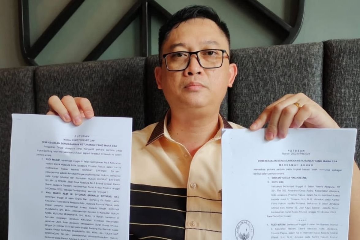 Jayapura, Jayatvpapua.com – Sengketa tanah di Jalan Pasar Lama, Abepura, Kota Jayapura, yang melibatkan Rudi Maswi melawan Briyan Yosua Fingkreuw dan Ruth Awi, resmi berakhir dengan kemenangan Rudi Maswi. Mahkamah Agung, melalui Putusan Nomor 2602 K/Pdt/2024, menegaskan bahwa Rudi Maswi adalah pemilik sah tanah tersebut. Hal ini sejalan dengan putusan sebelumnya oleh Pengadilan Tinggi Jayapura, Nomor 55/PDT/2023/PT JAP.