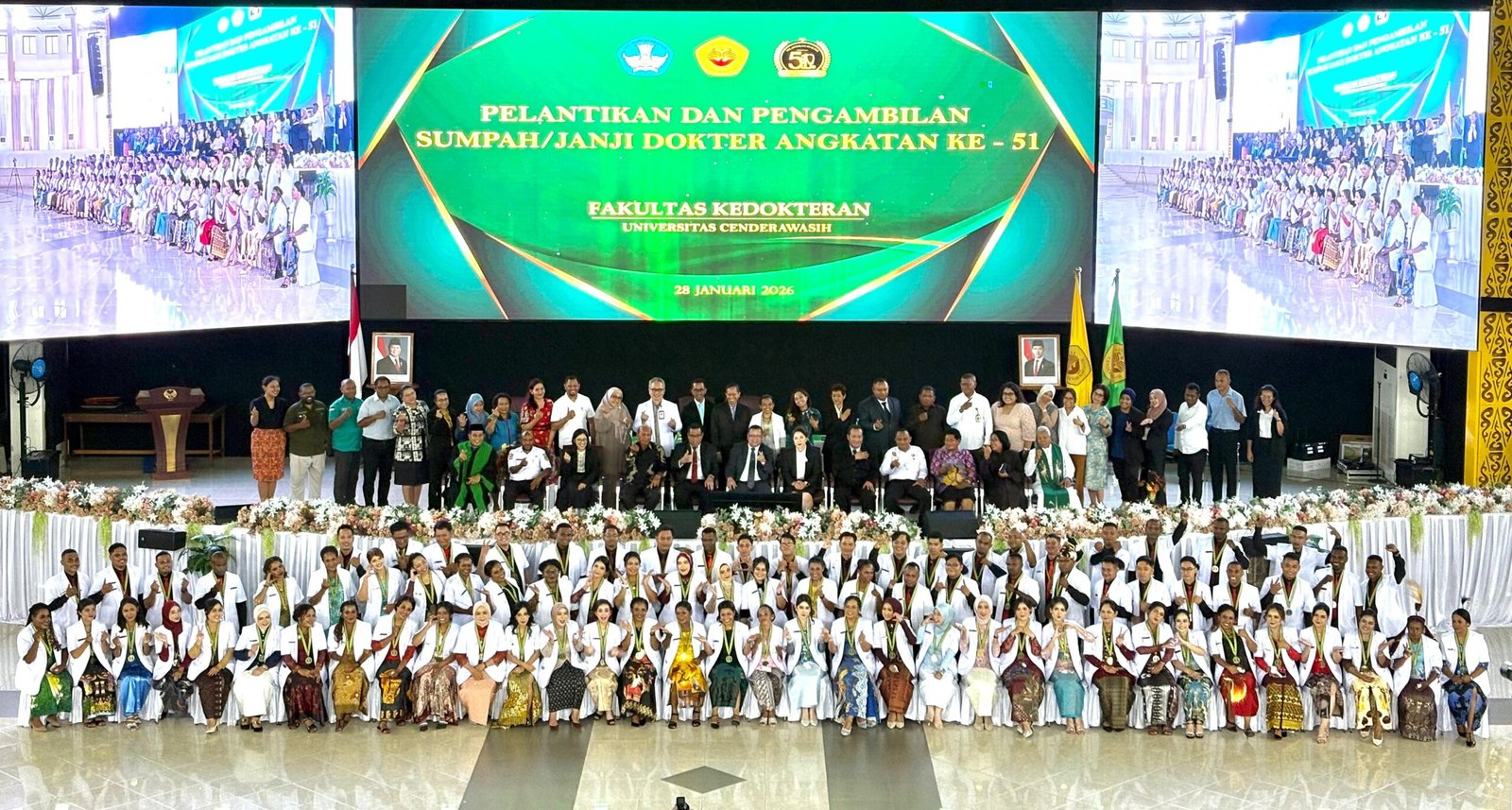 Jayapura, JayaTvPapua.com – Fakultas Kedokteran Universitas Cenderawasih (FK Uncen) kembali melahirkan puluhan dokter baru melalui prosesi pengambilan sumpah Dokter angkatan ke-51 yang berlangsung khidmat di Auditorium Kampus Uncen, Rabu (28/1/2026).
