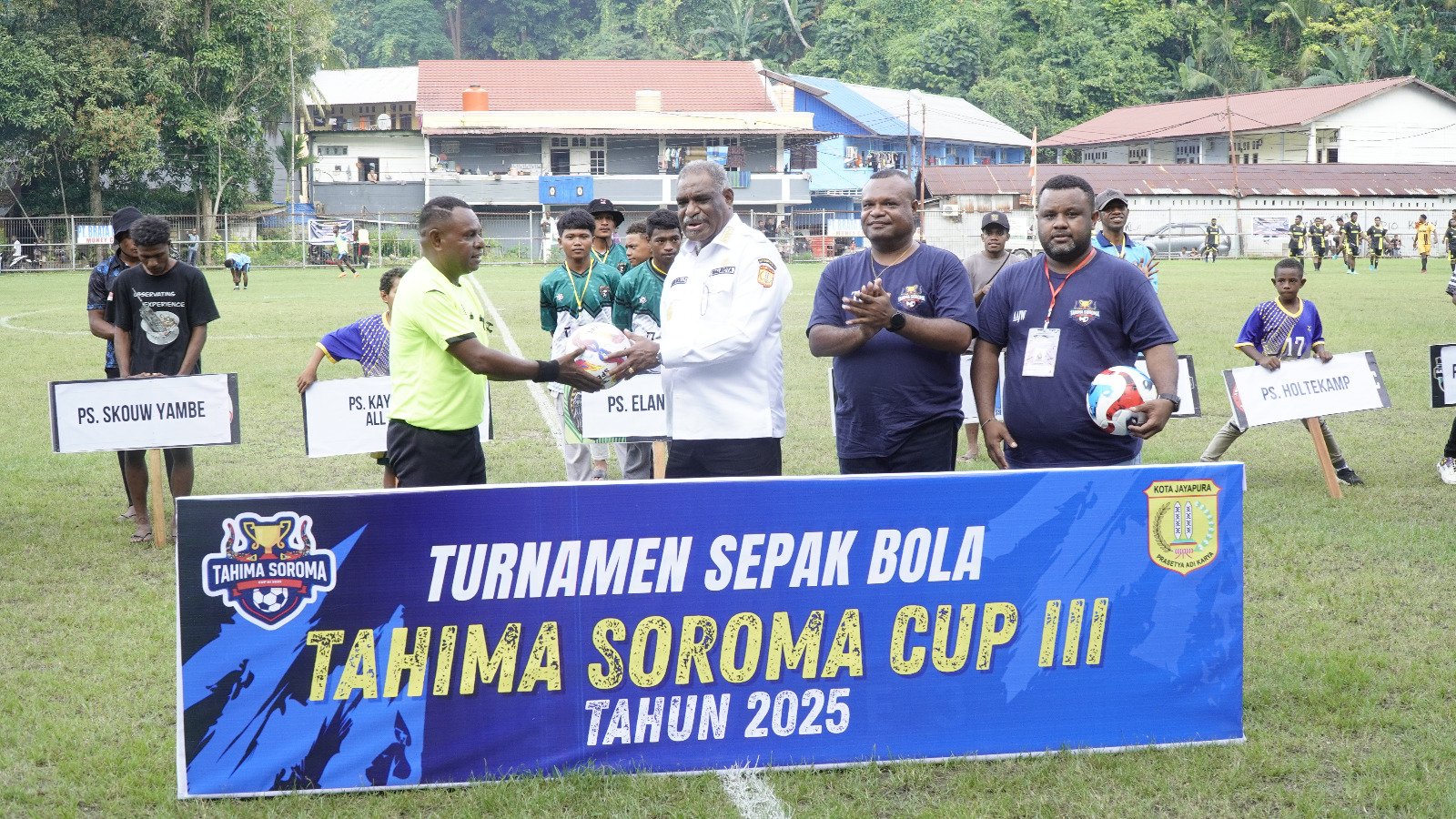 Jayapura, 3 Desember 2025 — Wali Kota Jayapura, Abisai Rollo, SH., MH., secara resmi membuka Turnamen Sepak Bola Tahima Soroma Cup III 2025 yang diselenggarakan di Lapangan Lengan Bergendal, Argapura. Turnamen yang menjadi agenda tahunan Pemerintah Kampung Tahima Soroma ini bertujuan mendorong pembinaan generasi muda melalui olahraga sekaligus memperkuat persatuan antar kampung.